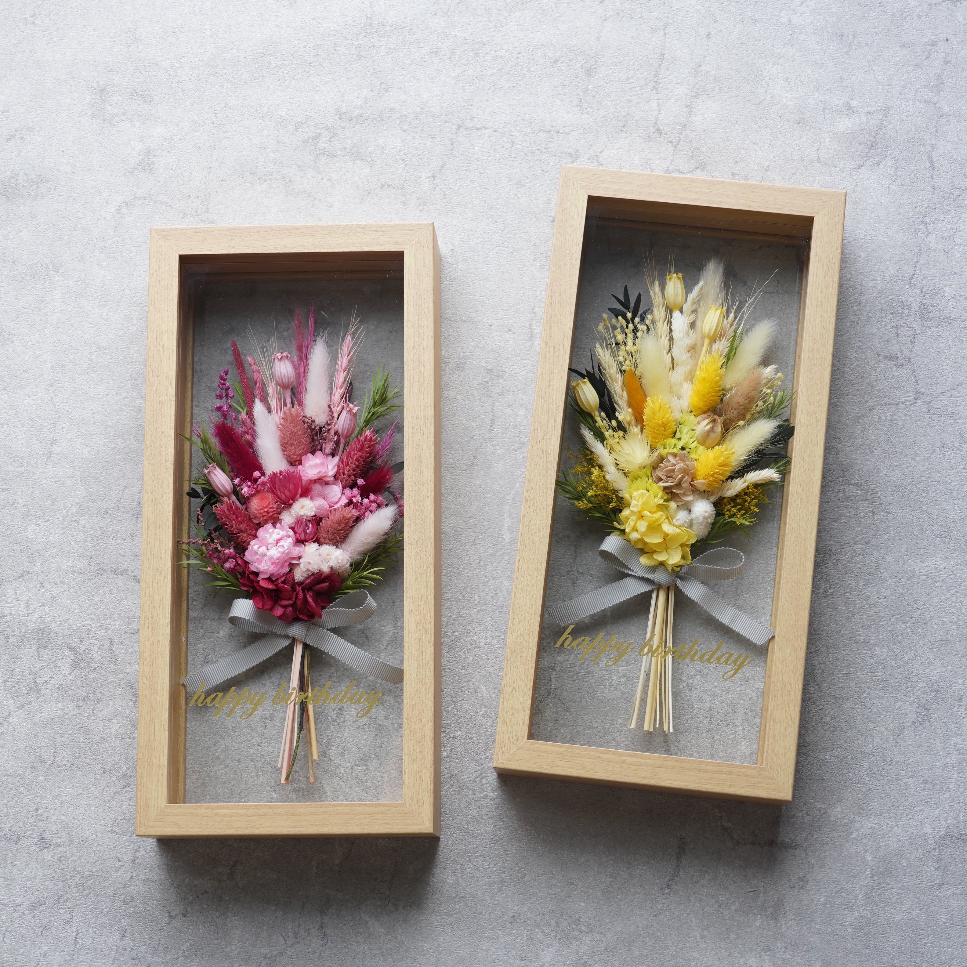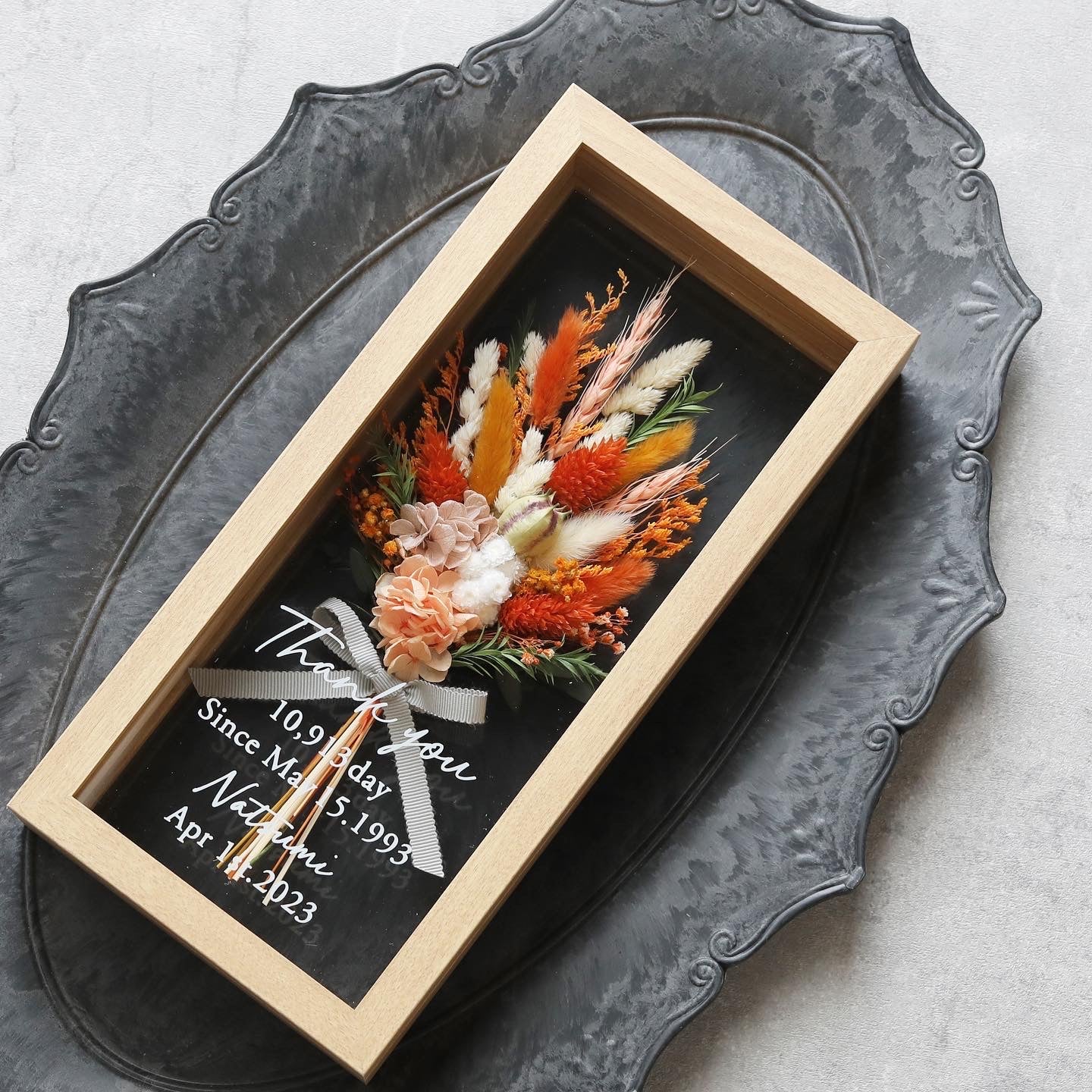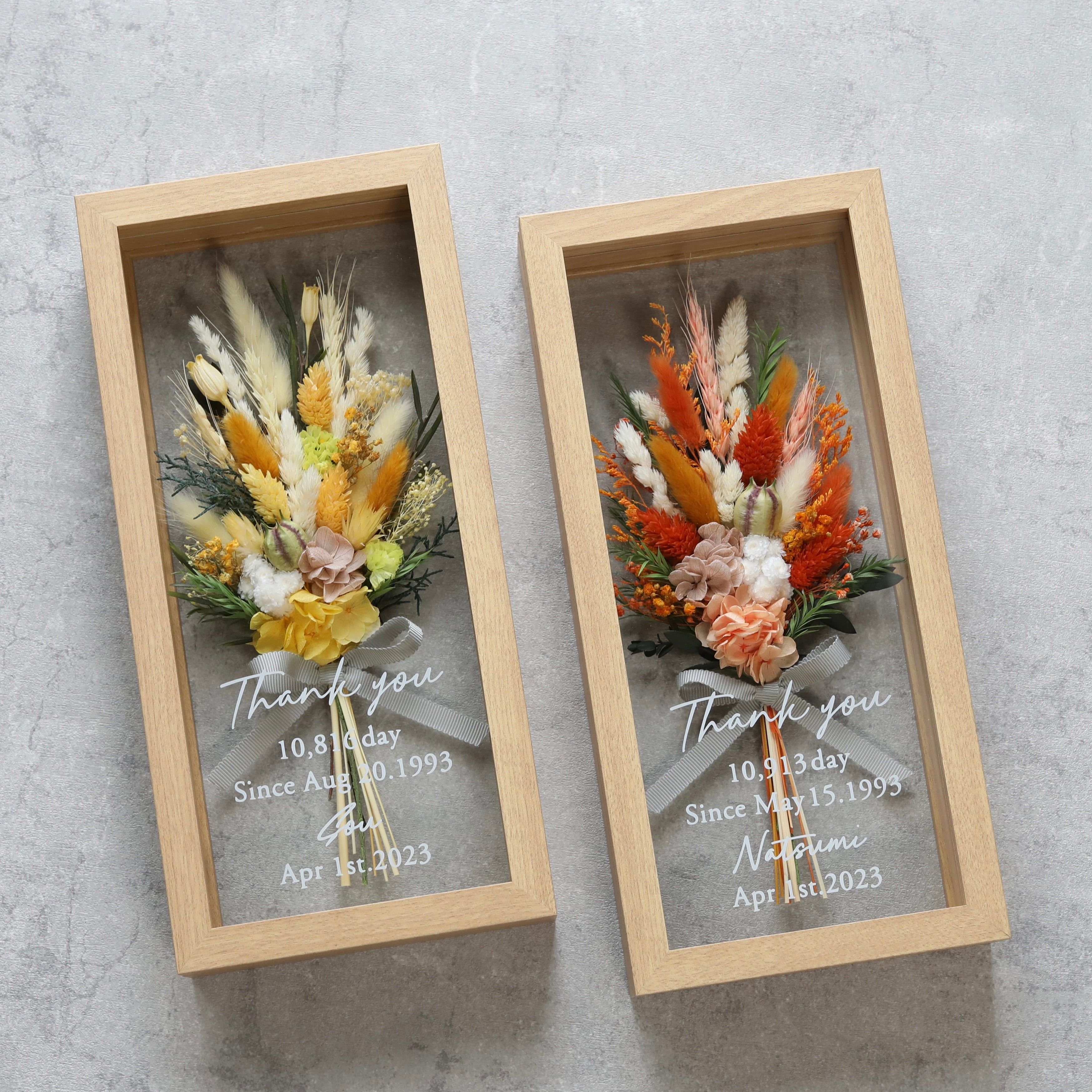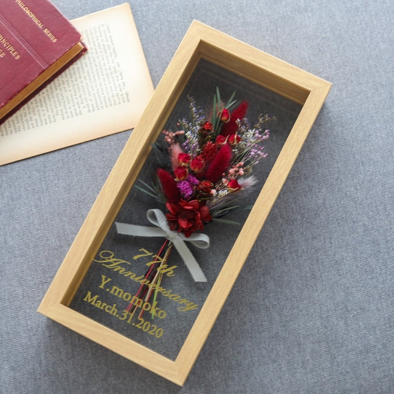 フレームのガラスにご希望のメッセージを入れることができるので、お誕生日や記念日、結婚式の贈り物に大人気です。